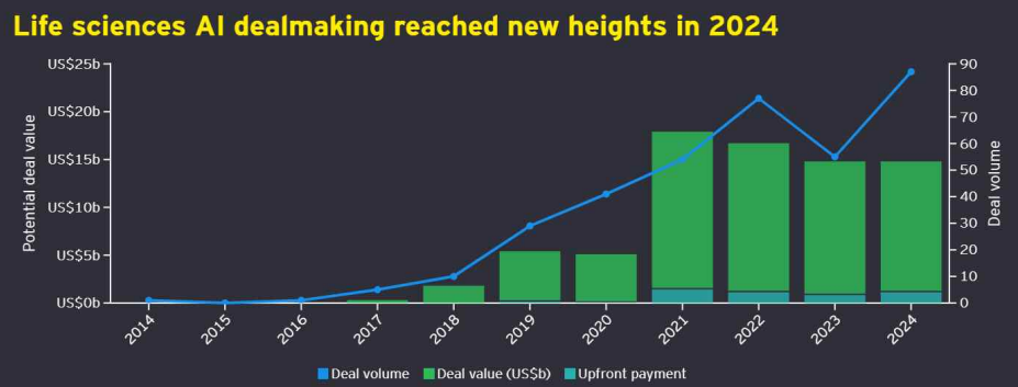 “The surge in AI partnerships and acquisitions over the past 5 years is indicative of the opportunities that AI presents to life sciences companies,” the report said, noting that the biggest focus is on using AI to discover new drugs and optimize development.