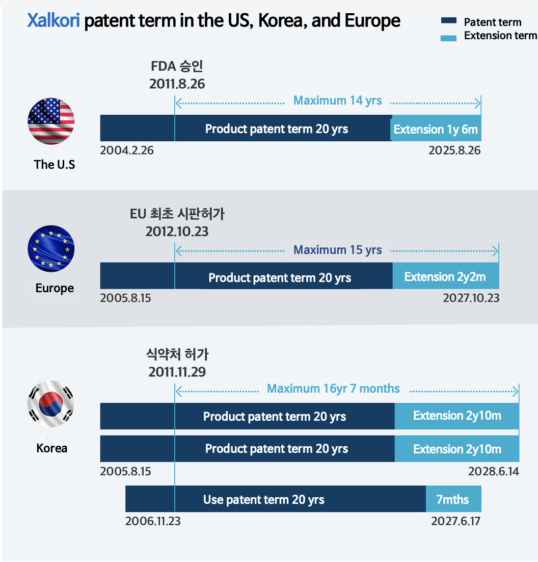 The patent extension period for Xalkori in Korea is 2 years and 10 months (1,034 days), which is about 1 year and 4 months (16 months) longer than in the US.