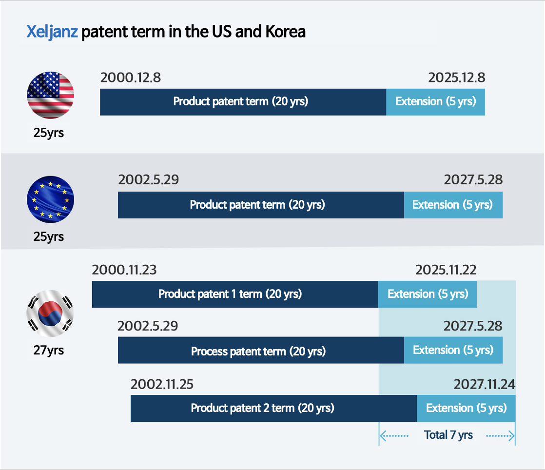 As a result, the patent term for Xeljanz in Korea is approximately 2 years (732 days) longer than in the US and Europe.