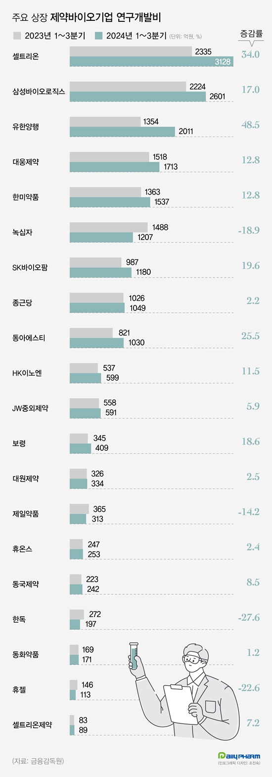 Celltrion, Samsung Biologics, Yuhan Corp, Daewoong Pharmaceutical, Hanmi Pharmaceutical, SK Biopharmaceuticals, Chong Kun Dang, Dong-A ST, HK Inno.N, JW Pharmaceutical, Boryung Pharmaceutical, Daewon Pharm, Huons, Dongkook Pharmaceutical, Dongwha Pharmaceutical, and Celltrion Pharmaceutical showed an increase in R&D expenditures through the third quarter compared to last year.