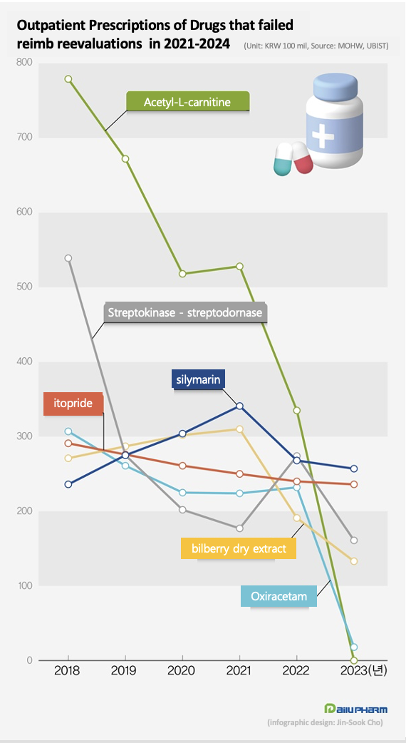 Streptokinase - streptodornase (Strepto preparations), oxiracetam, and acetyl L-carnitine, which were eligible for reimbursement but failed to pass the MFDS’s clinical reassessment, have seen their prescription market decline to the point of extinction.