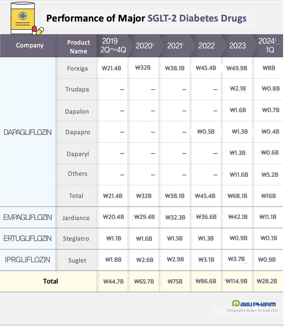 Among dapagliflozin drugs, Forxiga is followed by Boryung’s Trudapa and Hanmi Pharmaceutical's Dapalon, which generated sales of KRW 2.1 billion and KRW 1.6 billion respectively last year.
