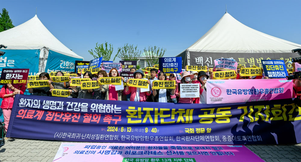 Ninety-two patient advocacy organizations, including the Severe Atopic Dermatitis Association, the Union of Korea Breast Cancer Patients, the Korean Alliance of Patients Organization, and the Korean Organization for Rare Diseases, held a press conference in front of the main gate of the National Assembly on the morning of the 13th to criticize the medical community's plans for a collective leave of absence.