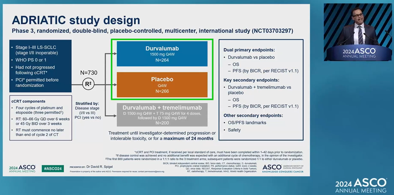 The Phase III ADRIATIC trial evaluated the efficacy of Imfinzi monotherapy and the Imfinzi+Imjudo combination versus placebo in 730 patients with limited-stage small-cell lung cancer whose disease had not progressed after concurrent chemoradiation therapy (cCRT).