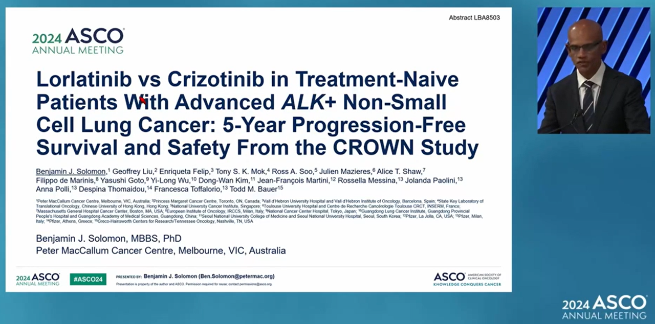 Solomon presented the CROWN clinical study results, which confirmed Lorviqua’s five-year survival benefit as the third-generation targeted therapy for ALK-positive cancer (source: snapshot of ASCO 2024 lecture presentation). On May 31st, the five-year follow-up clinical data of Lorviqua, a targeted drug for the treatment of ALK-positive NSCLC, were disclosed at ASCO 2024.
