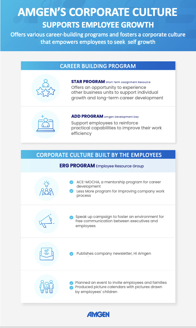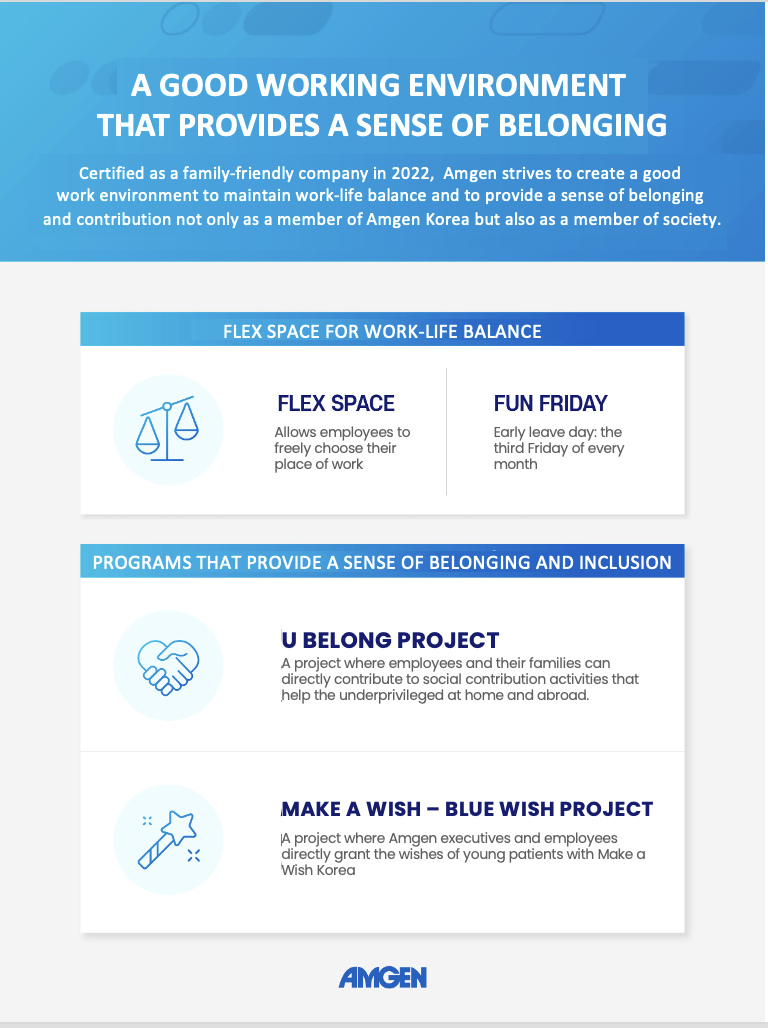 Amgen Korea has introduced Flex Space culture such as smart offices and Fun Friday, where employees can leave work early on the third Friday of every month to spend time with their families, encouraging employees to also focus on their lives outside of work.