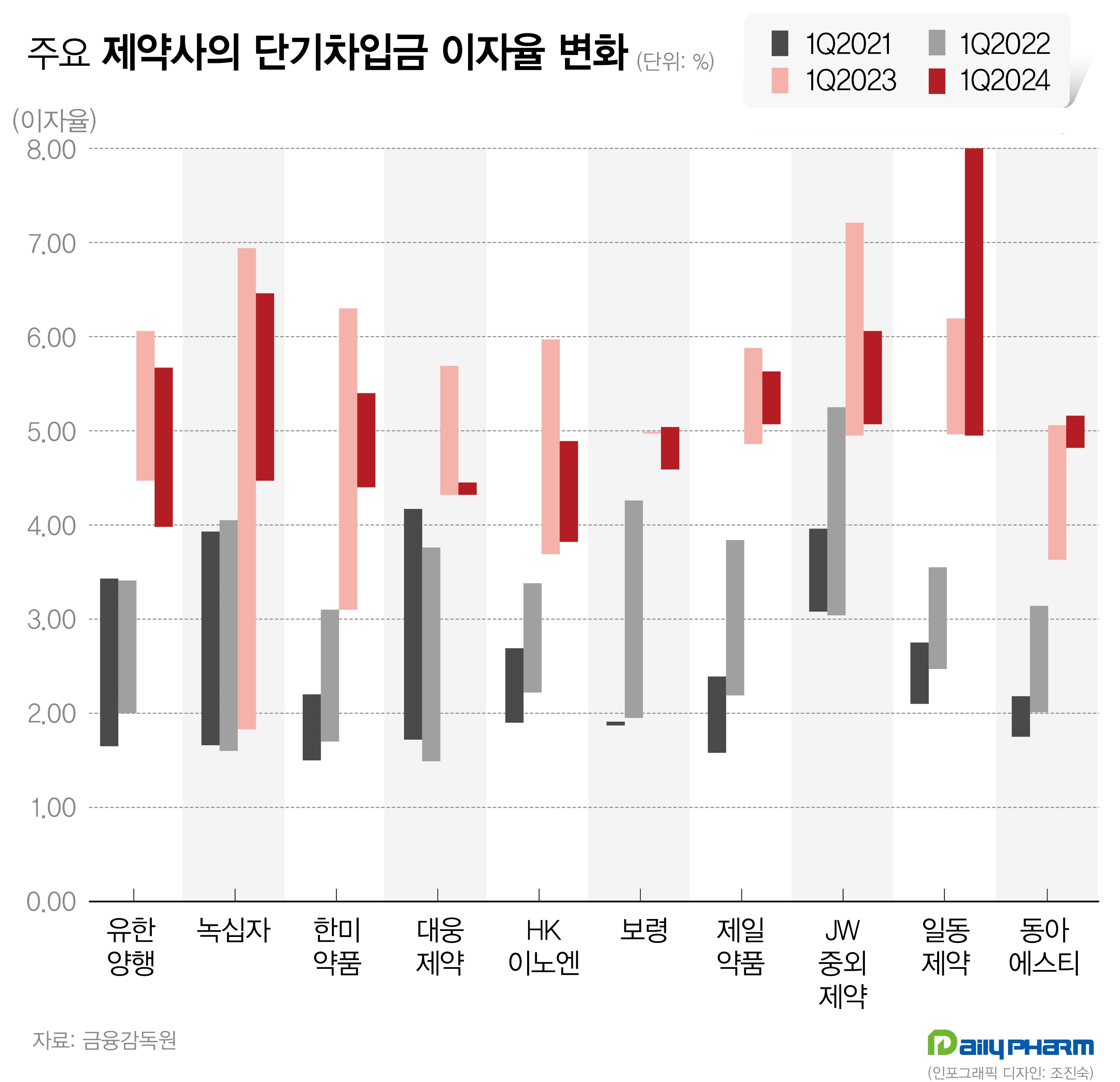 Furthermore, other companies, including Daewoong Pharmaceutical, HK inno.N, Boryung, Dongkook, Ildong Pharmaceutical, Dong-A ST, and JW Pharmaceutical, have been burdened by a high-interest rate of 5-8% for more than two years.