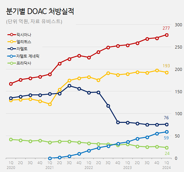 Quarterly DOAC prescription performance (unit: KRW 100 million, source: UBIST).