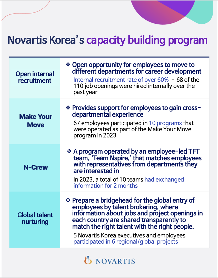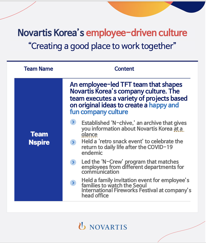Last year, employees in Korea had the opportunity to participate in more than 6 regional and global projects, and as Novartis Korea rose to become one of the top 10 countries in the world, employees from various regions such as those from the Swiss headquarters have also applied to come to Korea to test their skills.