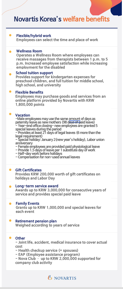 We offer at least 21 vacation days, which is 15 statutory vacation days plus 6 days, which increases by 1 day every 2 years up to 34 days. Maternity leave is 98 days, 8 days more than the stipulated 90 days, and male employees can also take about 14 weeks of paid paternity leave when their spouse gives birth.