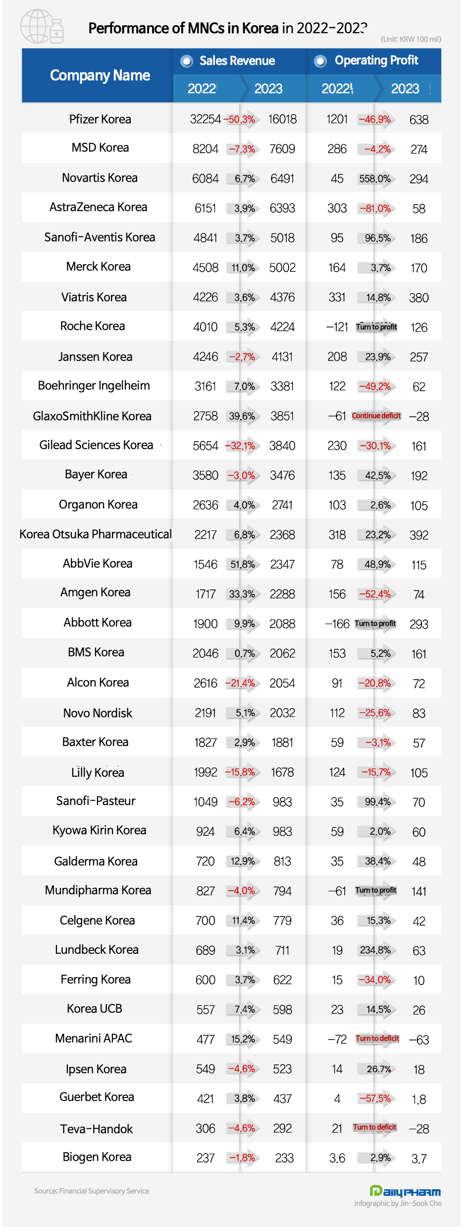 Sales of Pfizer Korea, MSD Korea, and Gilead Sciences Korea, which developed COVID-19 vaccines and treatments, plummeted due to the base effect of the pandemic.