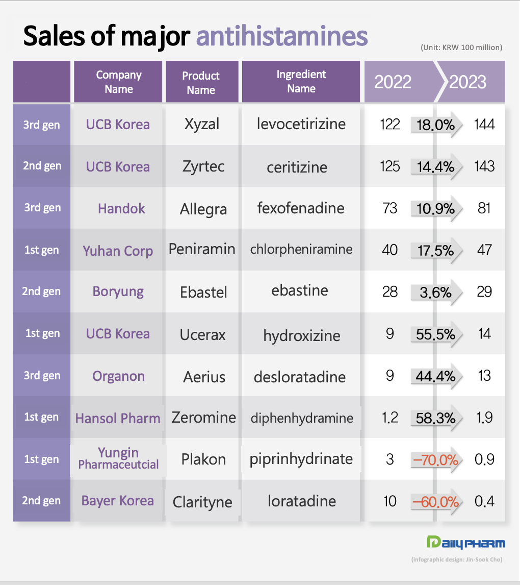 UCB Korea’s Zyrtec, a second-generation antihistamine, generated sales of KRW 14.3 billion last year, up 14.4% from KRW 12.5 billion in 2022.