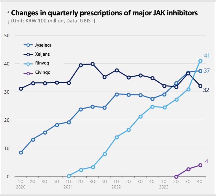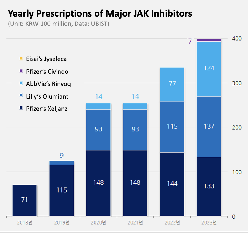 Last year, Olumiant’s prescriptions reached KRW 13.7 billion, Xeljanz KRW 13.3 billion, and Rinvoq KRW 12.4 billion.
