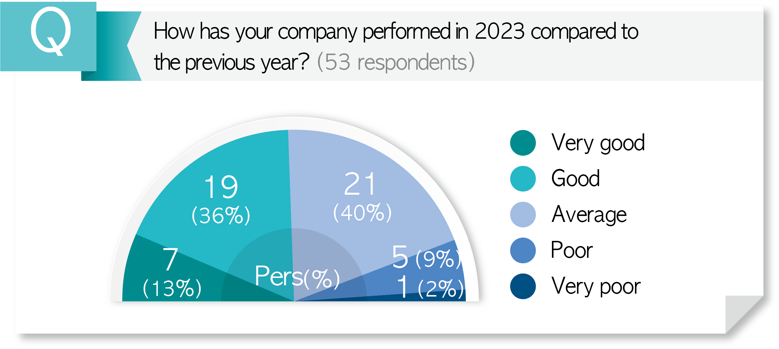 When asked about their business performance in 2023, 49% of respondents (26) chose ‘very good’ or ‘good.’ 40% of the respondents (21) said ‘moderate,’ and only 11% (6) said ‘poor’ or ’very poor.’