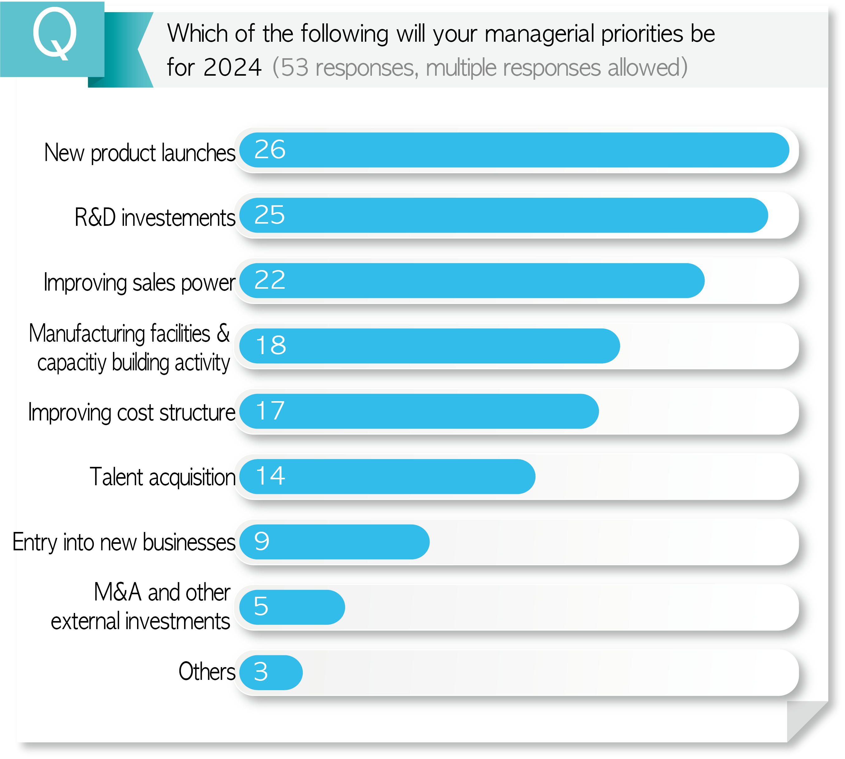This was followed by ▲ R&D investment (25), ▲ strengthening sales power (22), ▲ improving manufacturing facilities and expanding production capacity (18), ▲ improving cost structure (17), ▲ securing excellent human resources (14), ▲ entering new businesses (9), and ▲ external investment such as mergers and acquisitions (M&A) (5).