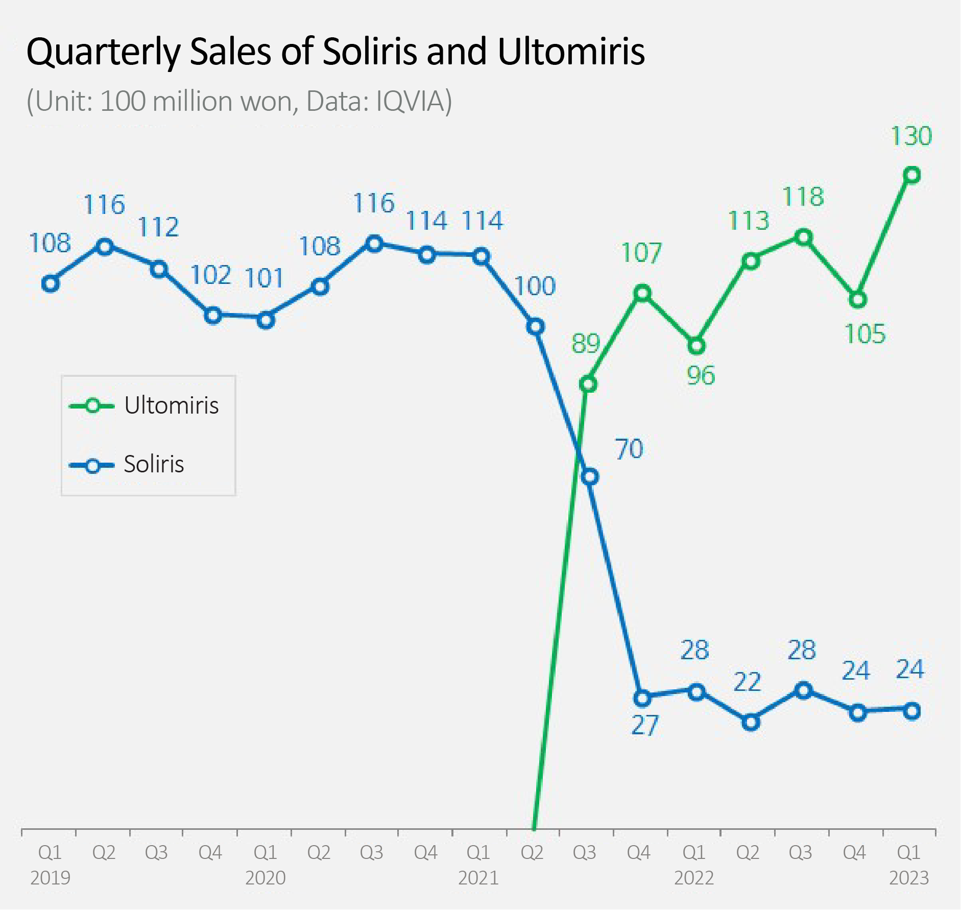 According to the market research institution IQVIA on the 12th, sales of Ultomiris in Q1 were KRW 13 billion, up 35% from KRW 9.6 billion in Q1 last year.