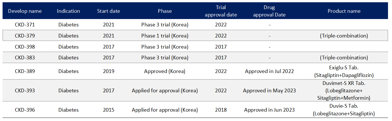 Among them, CKD-383 and CKD-379 are three-drug combination drugs for diabetes, presumably a combination product based on Duvie or Januvia.