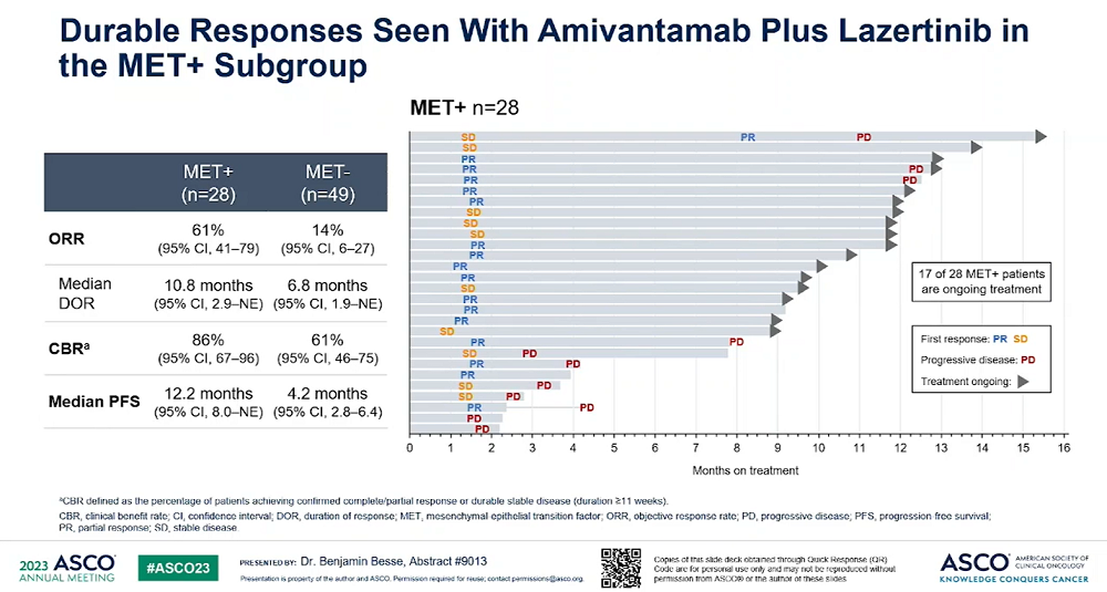 The objective response rate (ORR) of the combination therapy in patients with MET mutations and amplification (28 patients) was 61%, which was higher than 14% in the MET-negative patient group (49 patients).