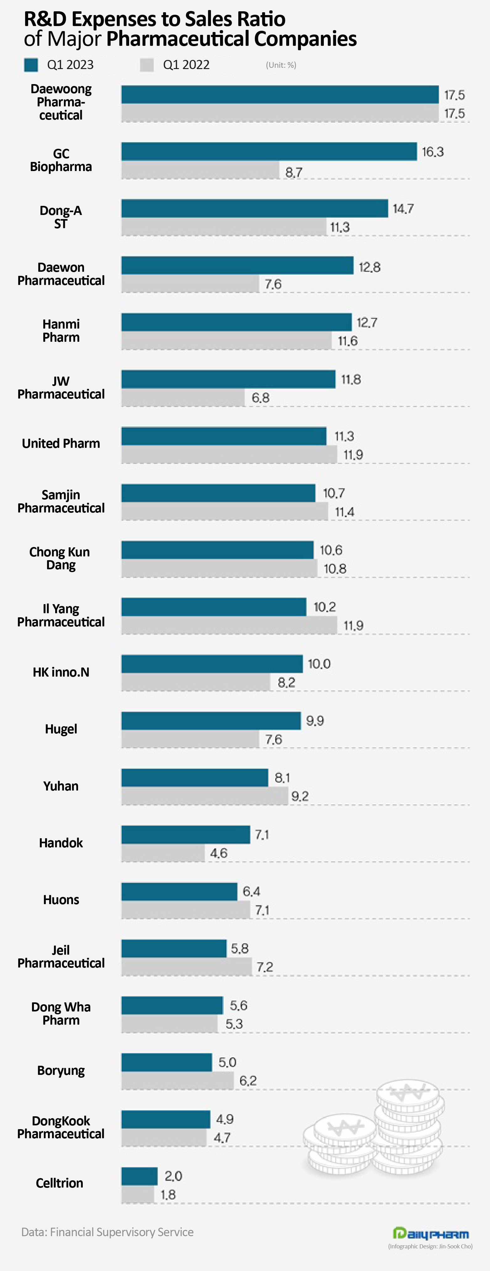 GC Biopharma, Dong-A ST, Daewon Pharmaceutical, Hanmi Pharmaceutical, JW Pharmaceutical, United Pharm, Samjin Pharm, Chong Kun Dang, and Ilyang Pharm invested more than 10% of their sales in R&D.