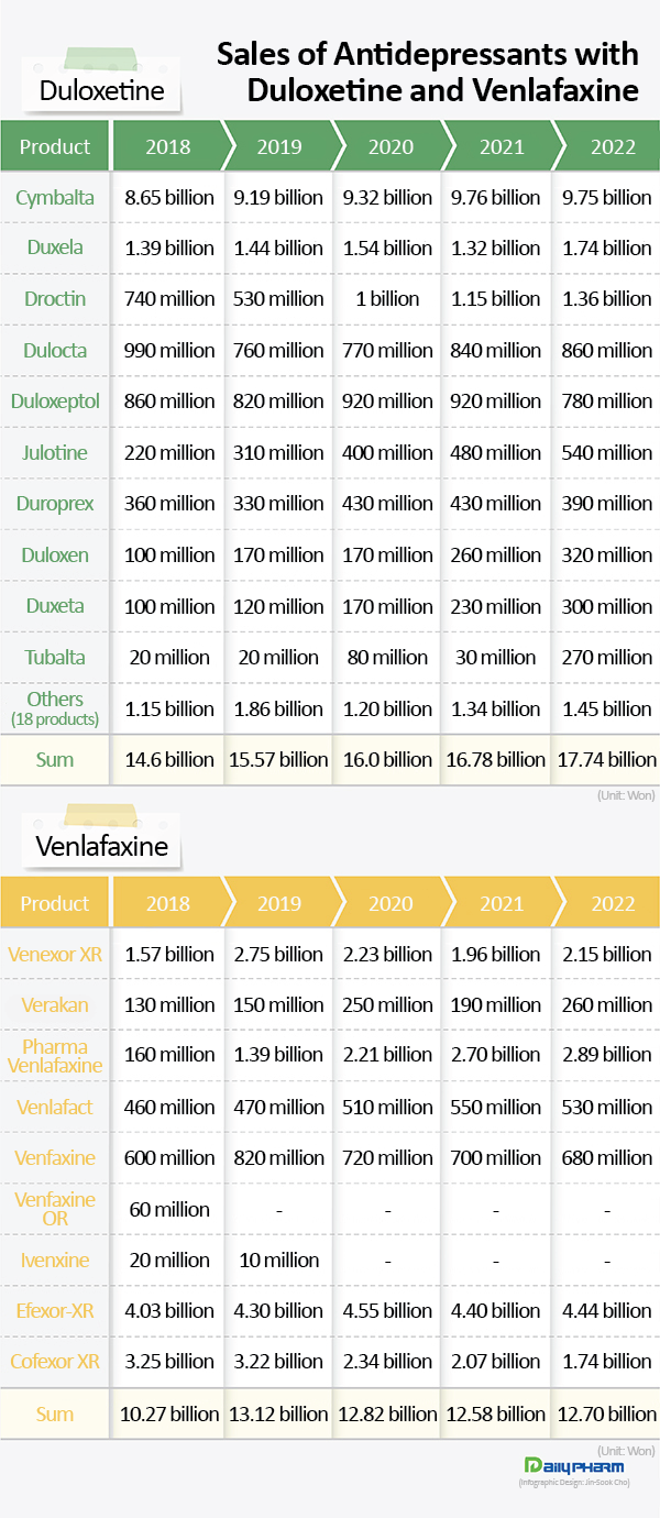 According to drug distribution data, sales of duloxetine drugs grew from KRW 15.5 billion to KRW 17.7 billion from 2019 to 2022, whereas sales of venlafaxine drugs showed a declining trend from KRW 13.1 billion to KRW 12.7 billion.