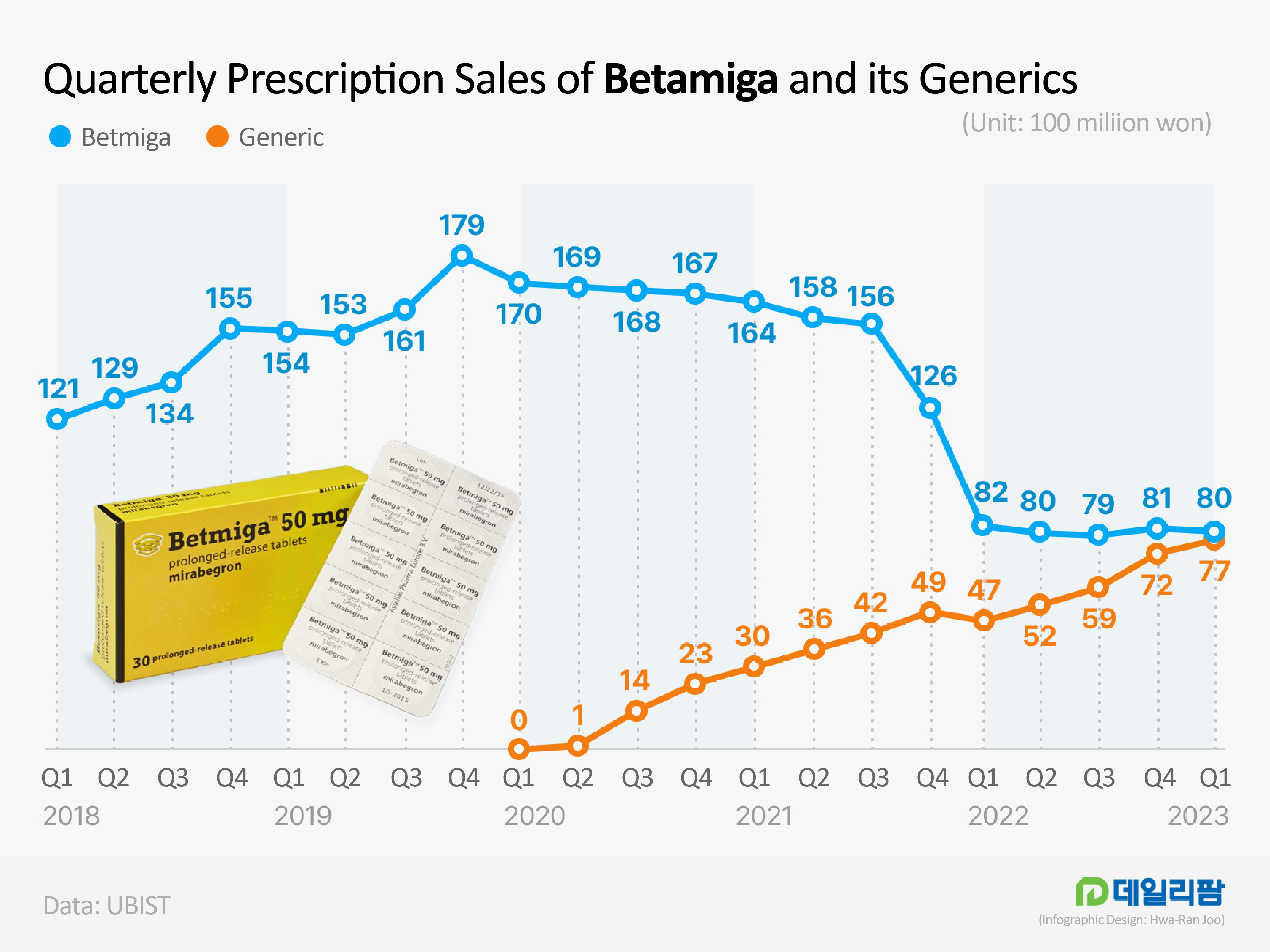 Betmiga’s generics increase market share to 49%...Sales of original continue to decline According to the market research institution UBSIT on the 6th, the OAB market for the mirabegron ingredient had been KRW 15.6 billion in Q1, which is a 21% increase from the KRW 12.9 billion in Q1 2022.