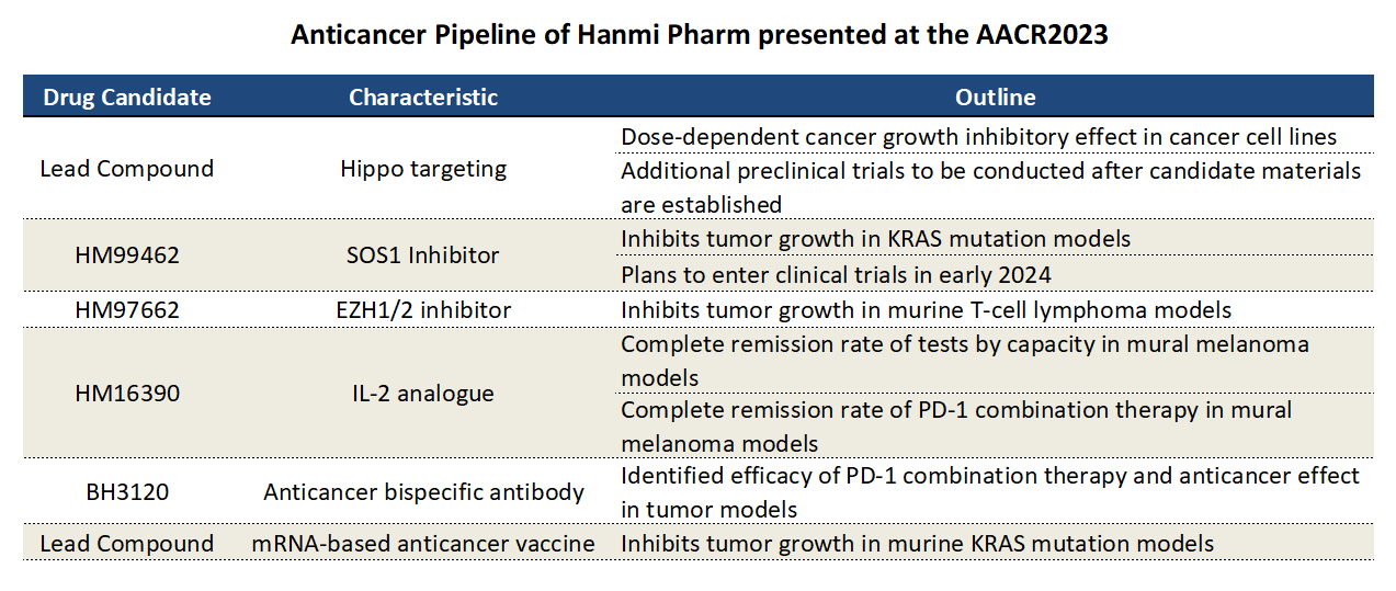 In addition to the lead compound for the new anticancer drug that targets the Hippo pathway, Hanmi Pharmaceutical also disclosed the results of preclinical studies related to 4 candidates in its major pipeline through abstracts in advance.