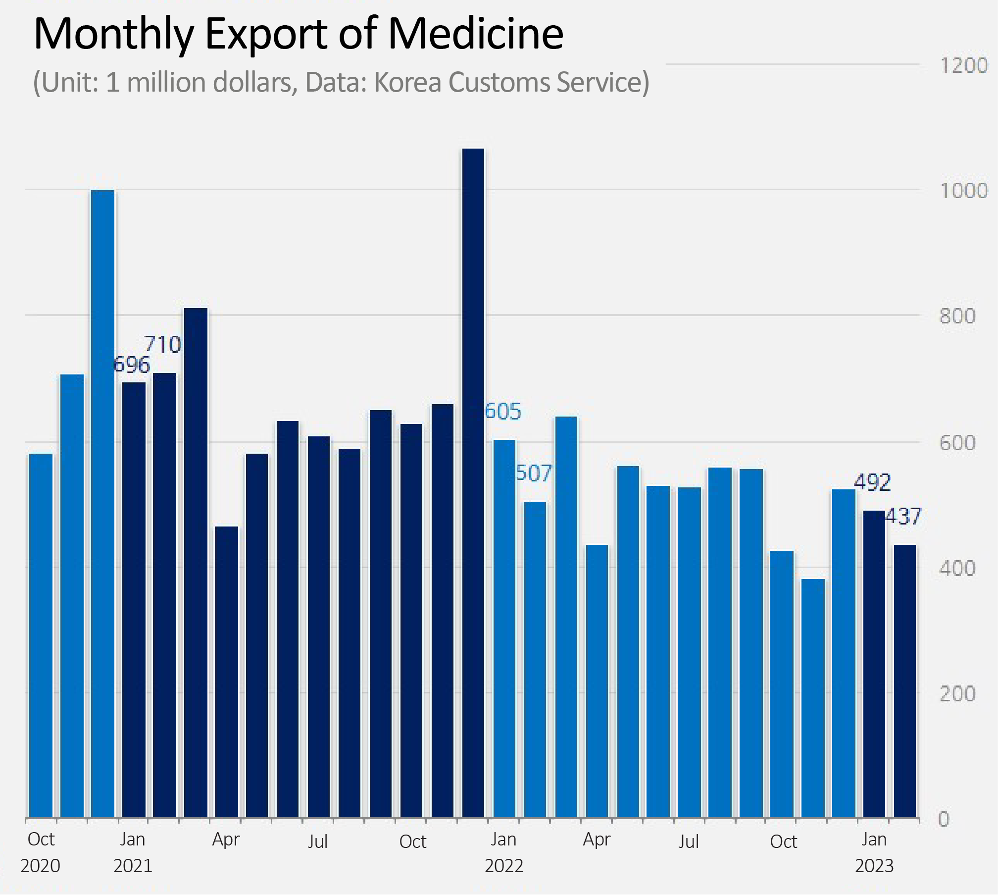During the prolonged COVID-19 crisis, Korea enjoyed an uprise in pharmaceutical exports, but due to the nearing endemic, exports are returning to the pre-COVID-19 level.