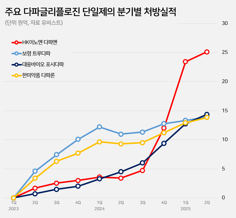 HK inno.N's Dapa N Prescription Sales Jump from KRW 300 Million → KRW 2.5 Billion in a Year According to the pharmaceutical market research firm UBIST on August 18, HK inno.N's Dapa N recorded prescription sales of KRW 2.5 billion in Q2, a significant increase from KRW 300 million in the same period last year.