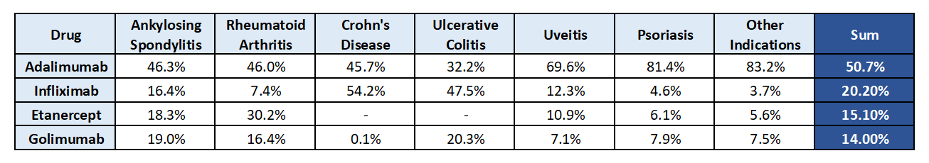 According to Evidnet, the most prescribed TNF-α inhibitor was adalimumab, which accounted for 50.7% of all prescriptions last year.