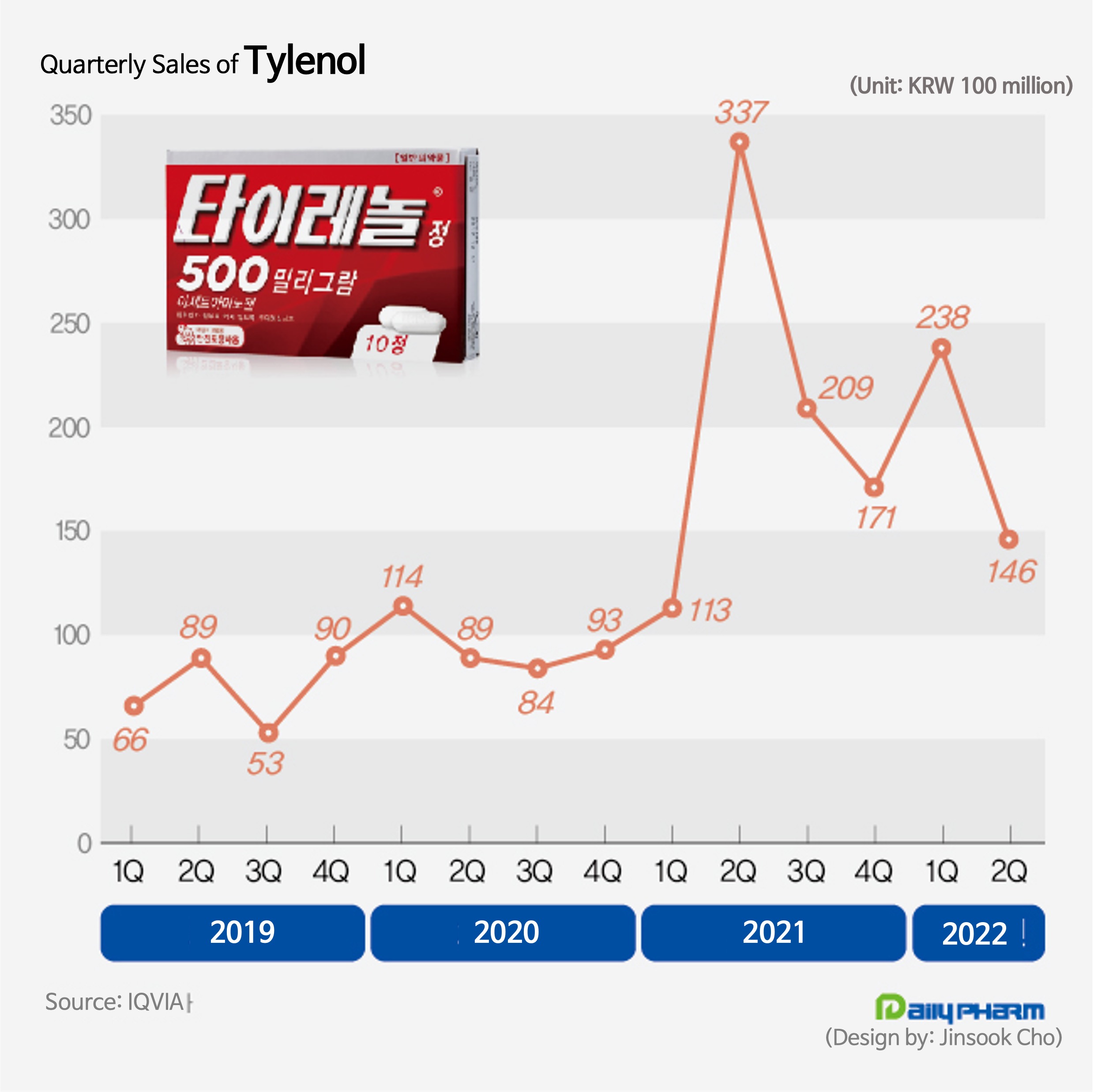 In its product line, sales of Tylenol tab fell 16% from KRW 33.6 billion to KRW 28.1 billion, and Tylenol 8 Hour ER by 33% from KRW 10 billion to 6.7 billion.