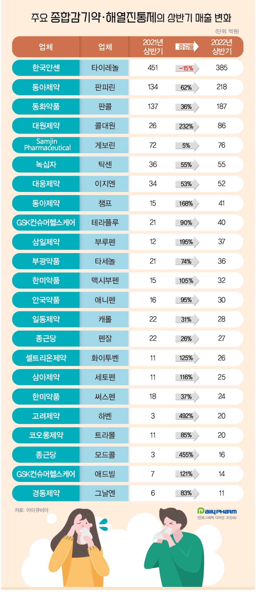 Ahngook Pharm’s Anyfen, GSK Consumer Healthcare’s Theraflu, Kolon Pharma’s Tramol, KyungDong Pharm’s Gnal-N, Bukwang Pharm’s Tacenol, GC Cross’s Taxen, Daewoong Pharmaceutical’s eZn has also increased by over 50%.
