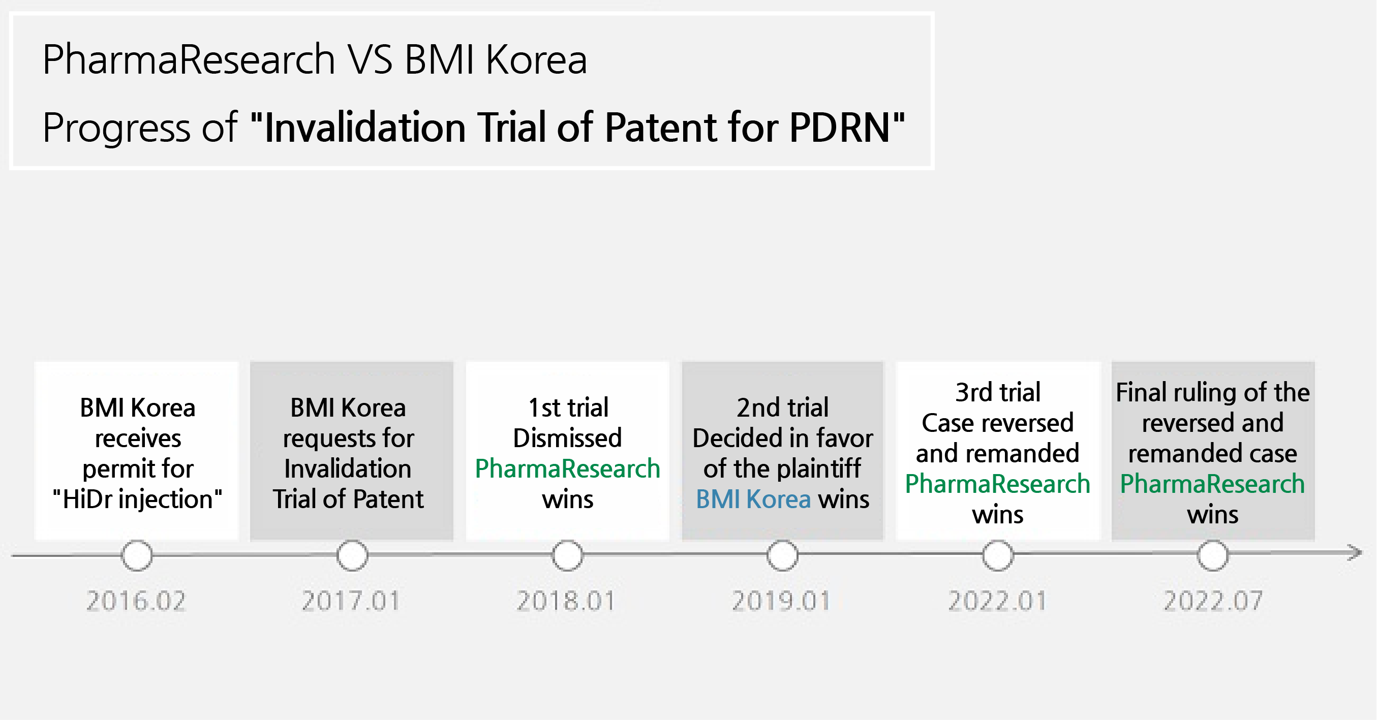 In January 2017, BMI Korea filed a trial against PharmaResearch to invalidate its PDRN manufacturing method.