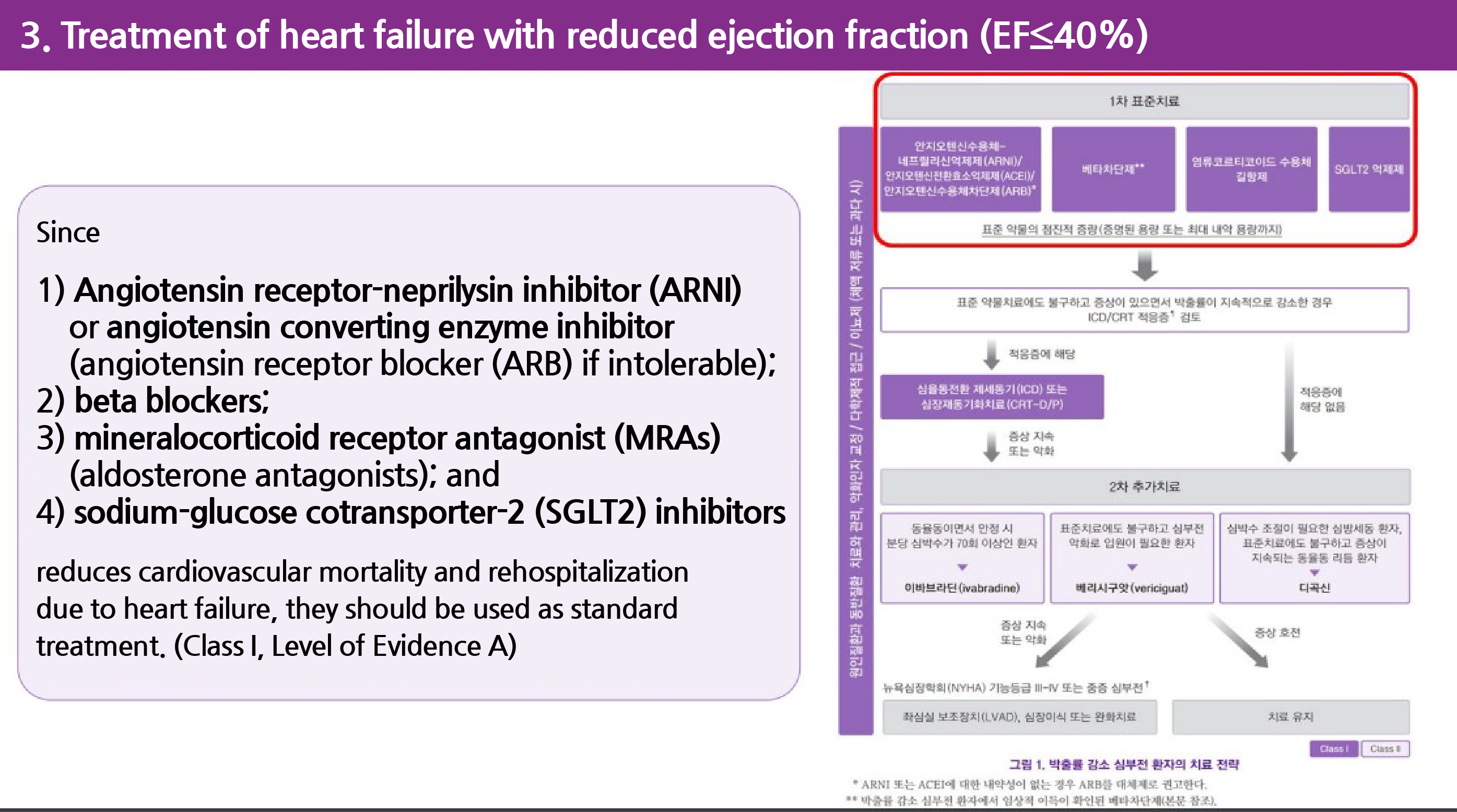 If EF continues to decrease despite standard drug therapy, the guidelines recommend treatments such as ivabradine, vericiguat, or digoxin as second-line treatments Also, diuretics, SGLT2 inhibitors, and ARNIs were recommended as primary treatments for HFmrEF and HFpEF, In the HFmrEF and HFpEF group, diuretics and SGLT2 inhibitors (empagliflozin or dapagliflozin) were recommended as a priority (Class I), and ARNI was then recommended (Class IIa, Level of Evidence B) Hyun-Jae Cho, Director of Clinical Practice Guidelines in KSHF (Professor of Cardiology at SNUH), said, “The revised guidelines contain updated definition and classification of HF that is more detailed than before.