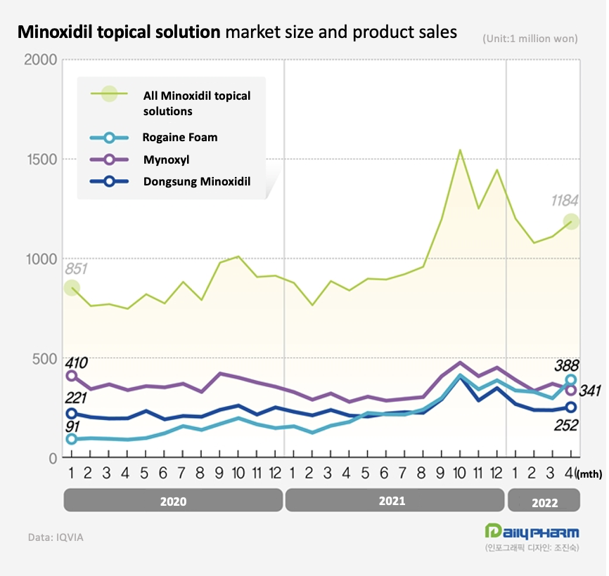 By April, cumulative sales made by Minoxyl amounted to ₩1.4 billion, and Dongsung Minoxidil to ₩1 billion.