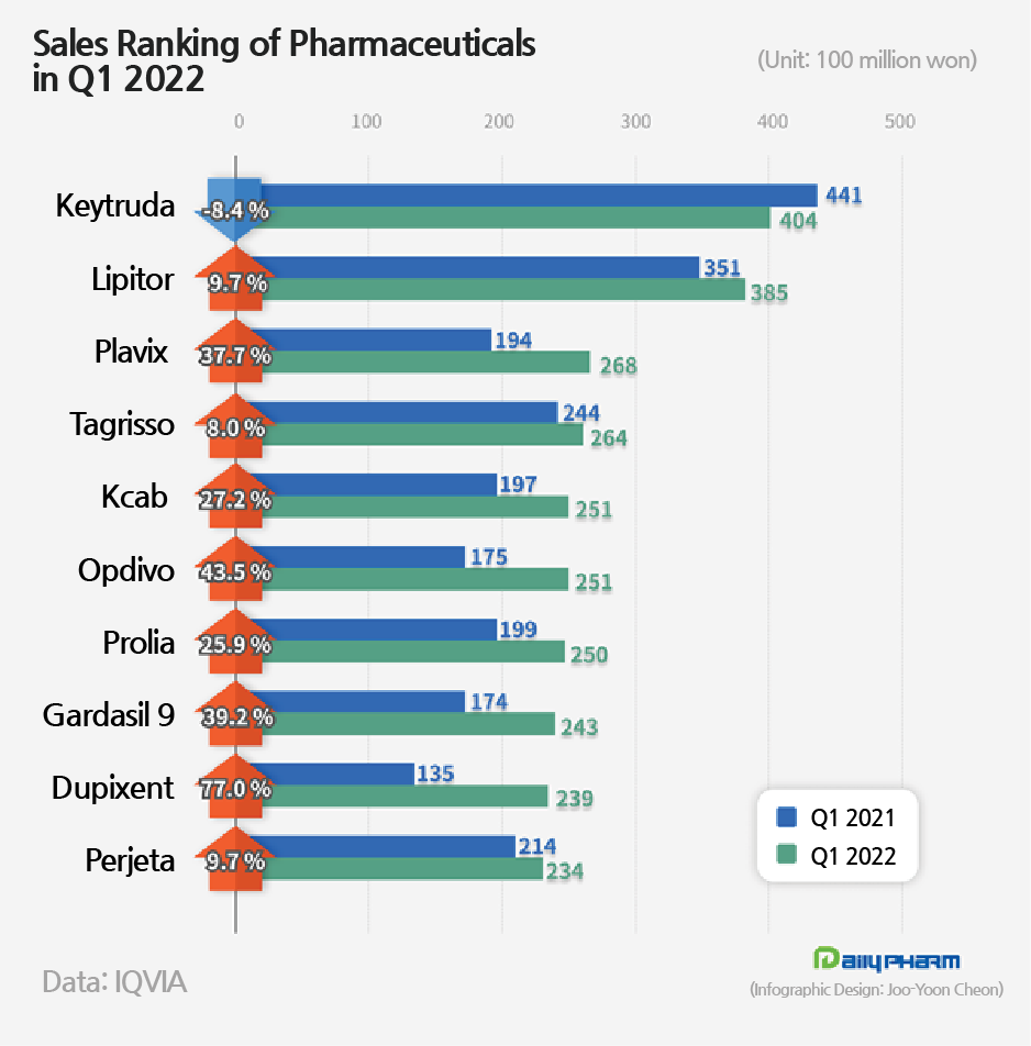 Sanofi’s antiplatelet Plavix recorded 3rd place with its sales increasing 37.7% YoY to record ₩26.8 billion in Q1 this year.