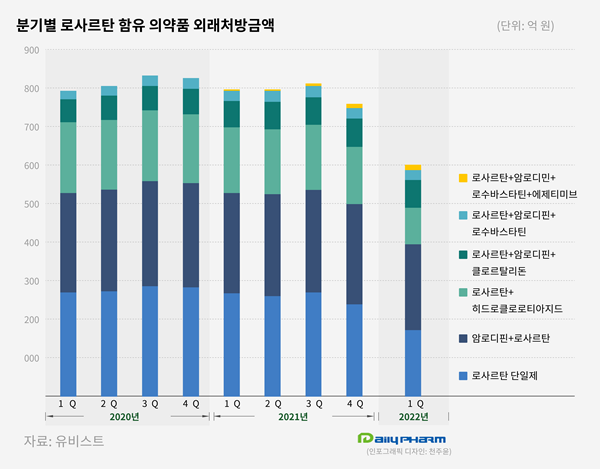 According to UBIST, a pharmaceutical research agency, on the 2nd, the outpatient prescription amount of Losartan-containing drugs in the first quarter was 60 billion won, down 24.4% from the same period last year-on- The prescription market for Losartan drugs rose 20.7% in four years from 65.8 billion won in the first quarter of 2017 to 79.5 billion won in the first quarter of last year, showing a stable upward trend every year.