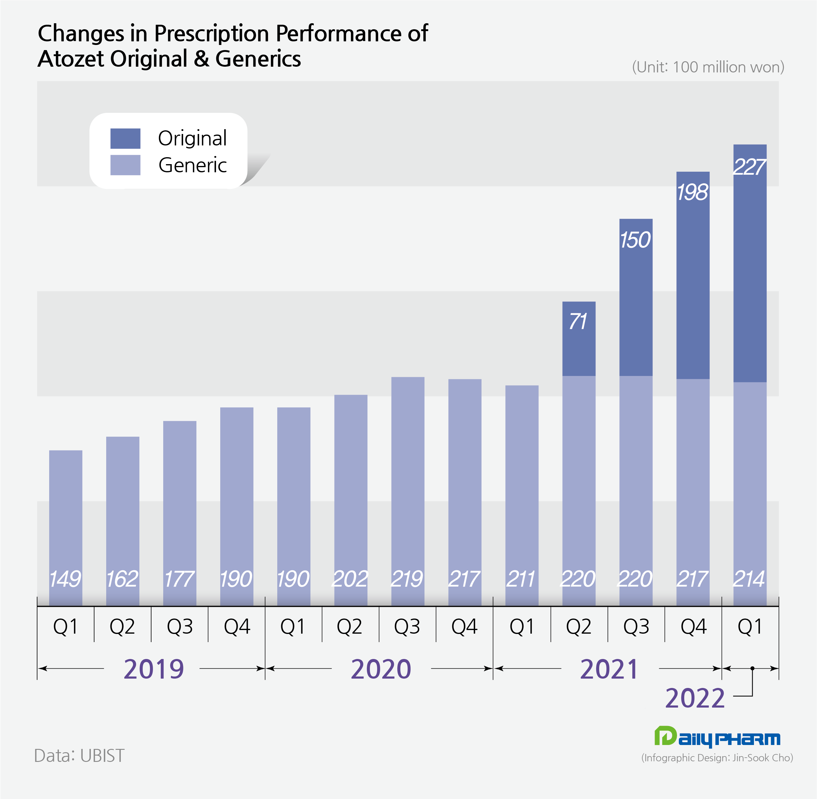 Prescriptions of Atozet in Q1 recorded ₩21.4 billion, a 1% increase from the same period of the previous year (₩21.1 billion) The market has expanded rapidly since Q2 last year when generic products started entering the market in earnest.