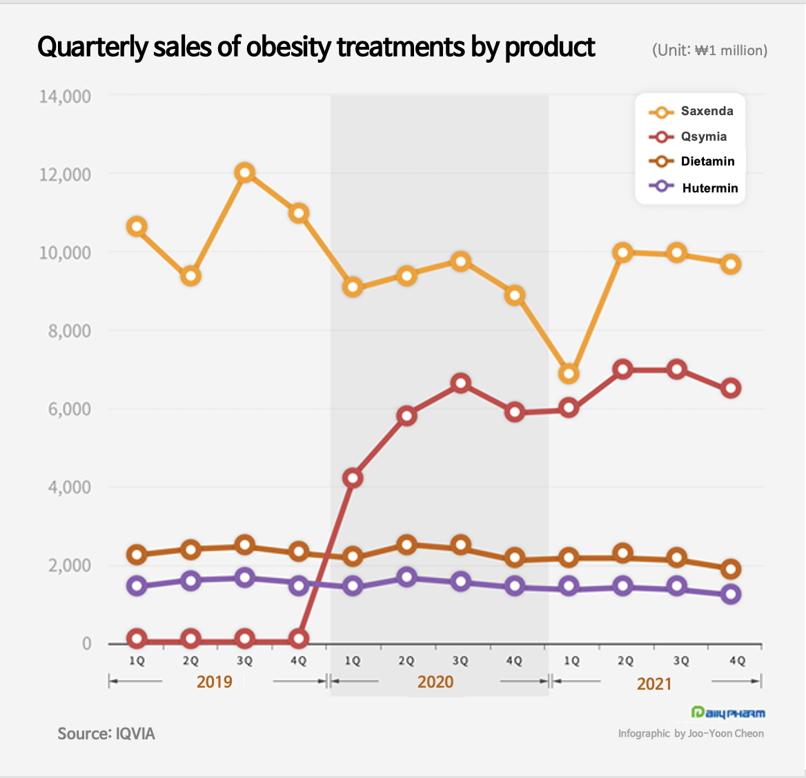 Saxenda’s average quarterly sales exceeded ₩10 billion in 2019, but fell to ₩9.1 billion last year.