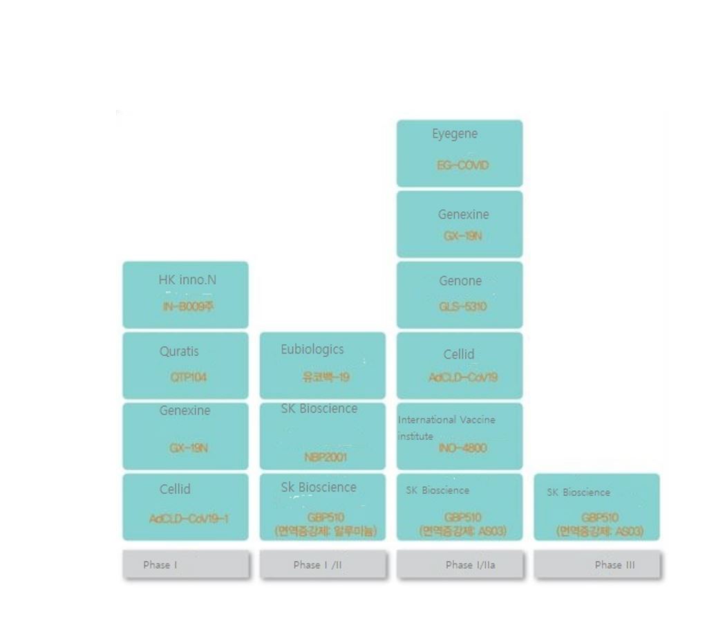 By vaccine platform, there are three genetically recombinant vaccines (SK Bioscience, EuBiologics, HK inno.N), three DNA vaccines (Genexine, Geneone, International Vaccine Institute), one virus vector vaccine (Cellid), and two mRNA vaccines (Quaratis, Eyegene).