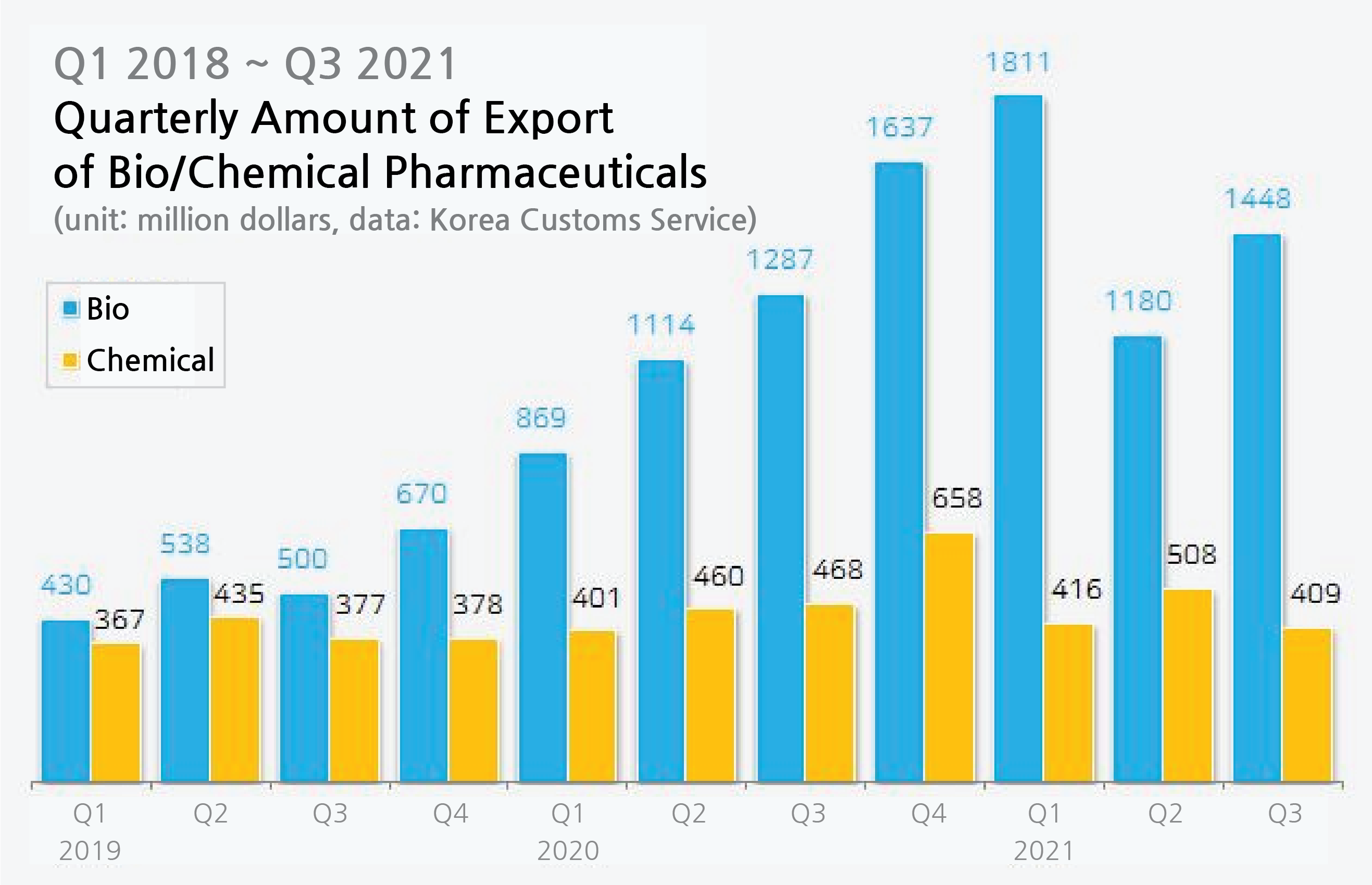 Export of biopharmaceuticals has soared over the past 2 years, mainly around biosimilars from Celltrion and Samsung Biologics.