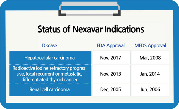 In Korea, after receiving the first-ever approval for hepatocellular carcinoma from the Ministry of Food and Drug Safety in March 2008, the drug has accumulated the most amount of treatment experience as the only first-line targeted therapy for over a decade since then.