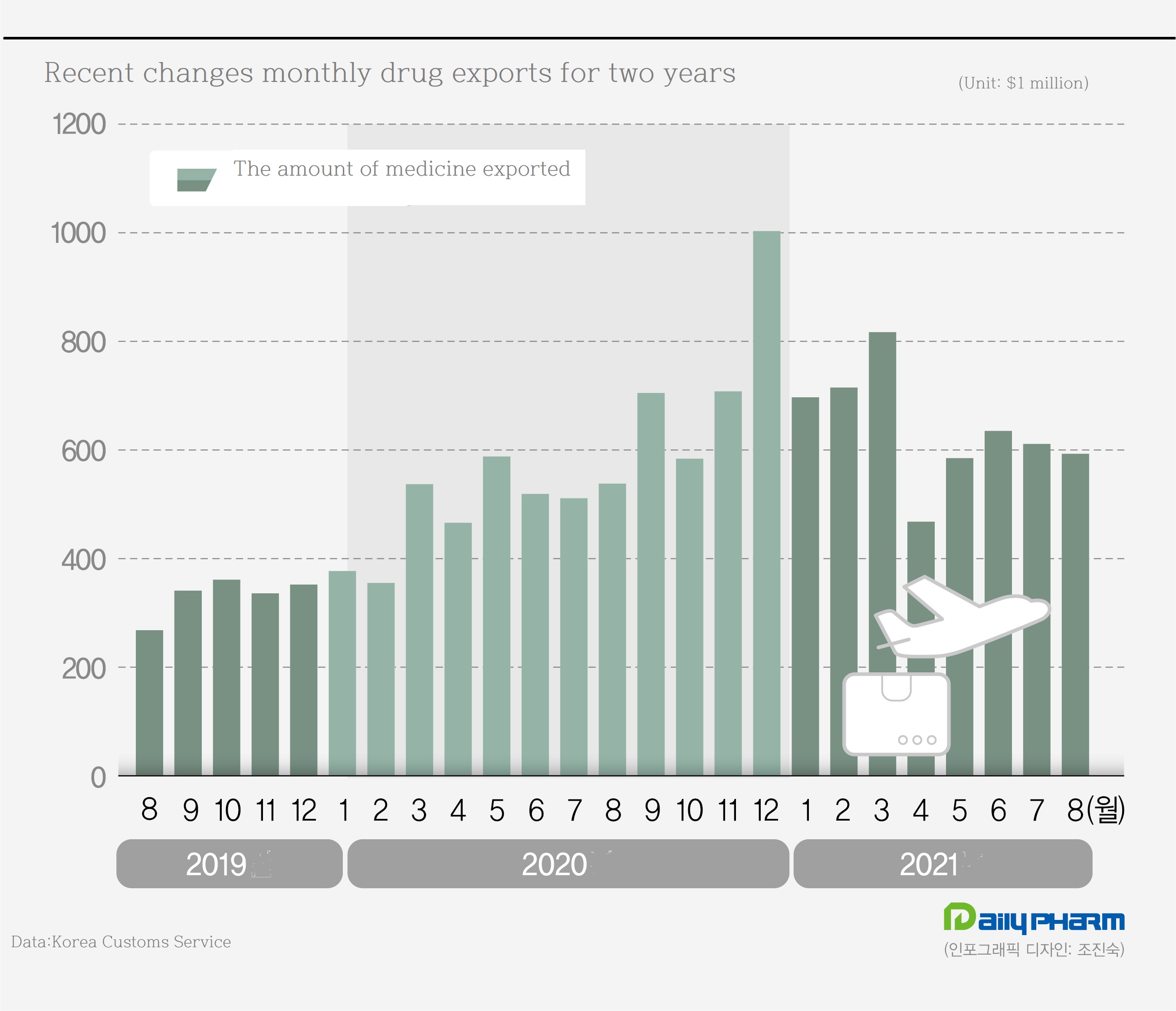 Drug exports rose 10% year-on-year to ₩700 billion last month.