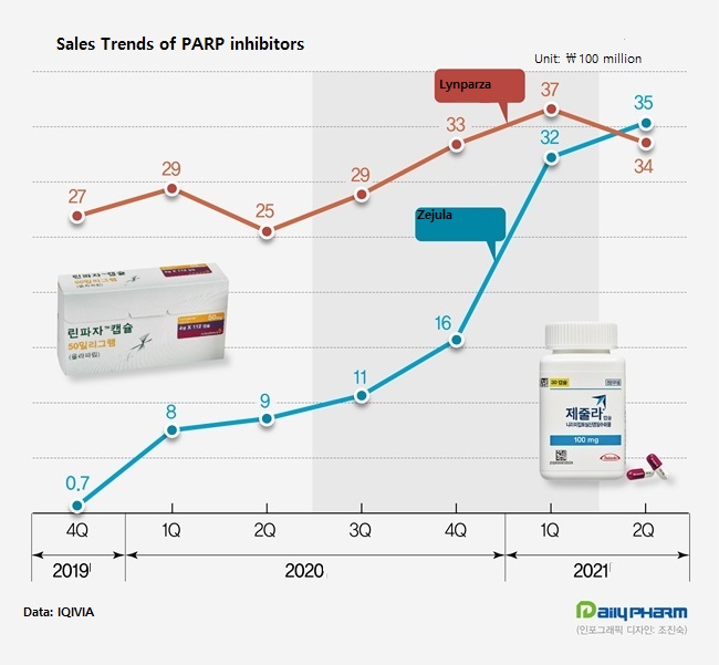 In the first quarter of last year, AstraZeneca's Lynparza, which previously dominated the market, showed ₩2.3 billion, ₩2.9 billion, ₩3.3 billion and ₩3.7 billion, respectively, but sales in the second quarter fell slightly to ₩3.4 billion.