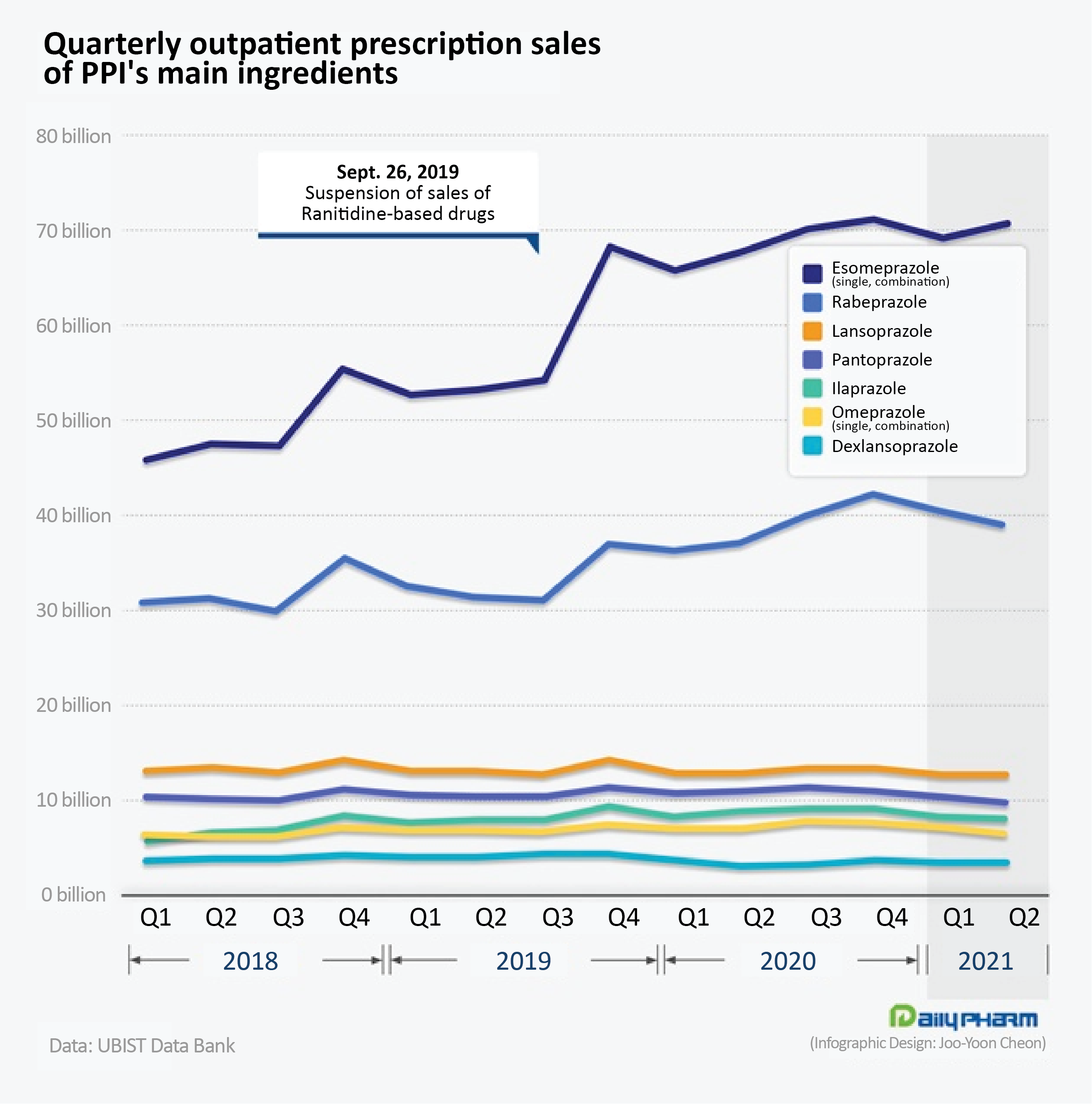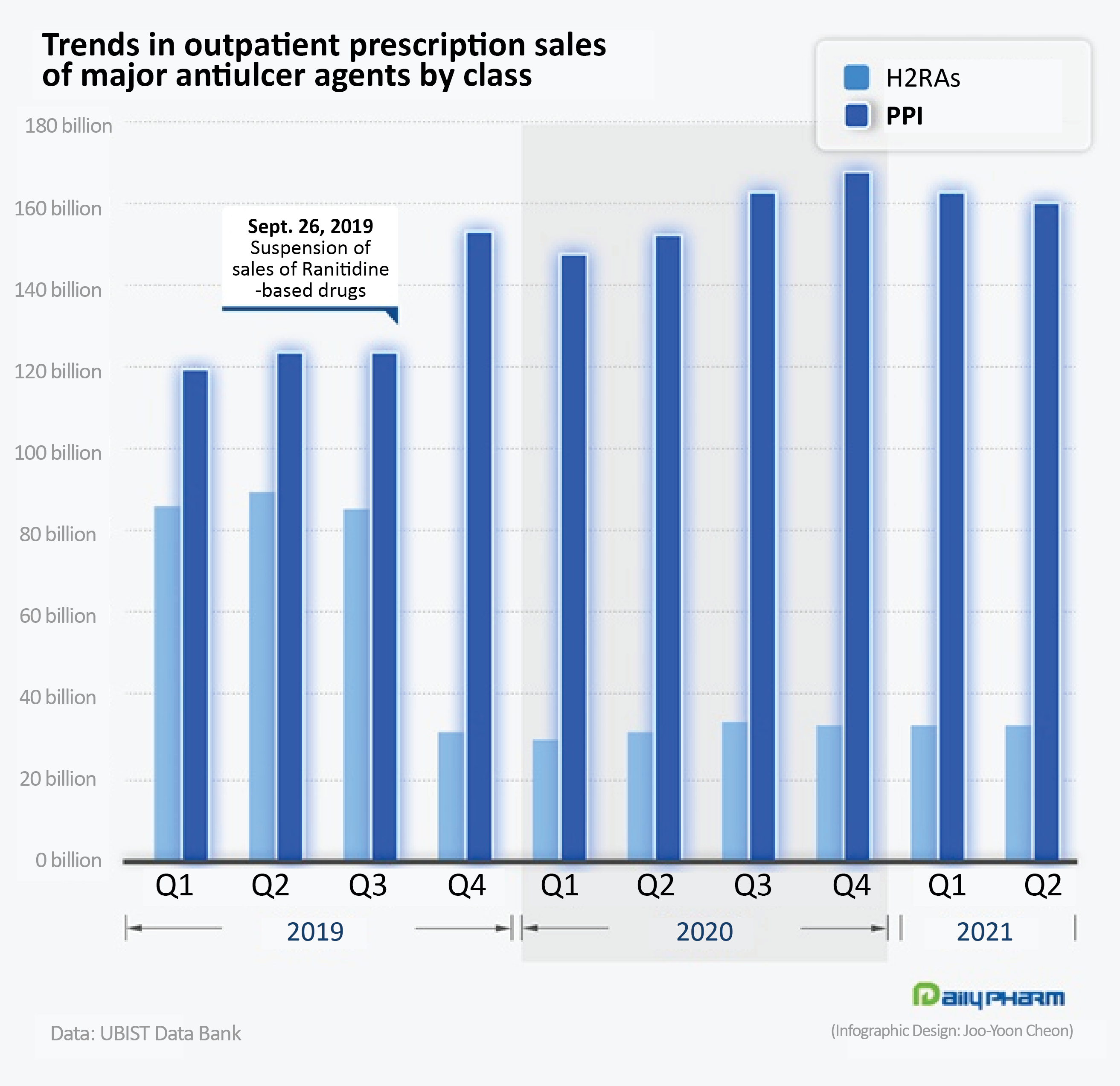 Despite the overall contraction of the prescription drug market due to the prolonged COVID-19 pandemic, PPI prescriptions have maintained quarterly sales of over ₩160 billion during the past year.