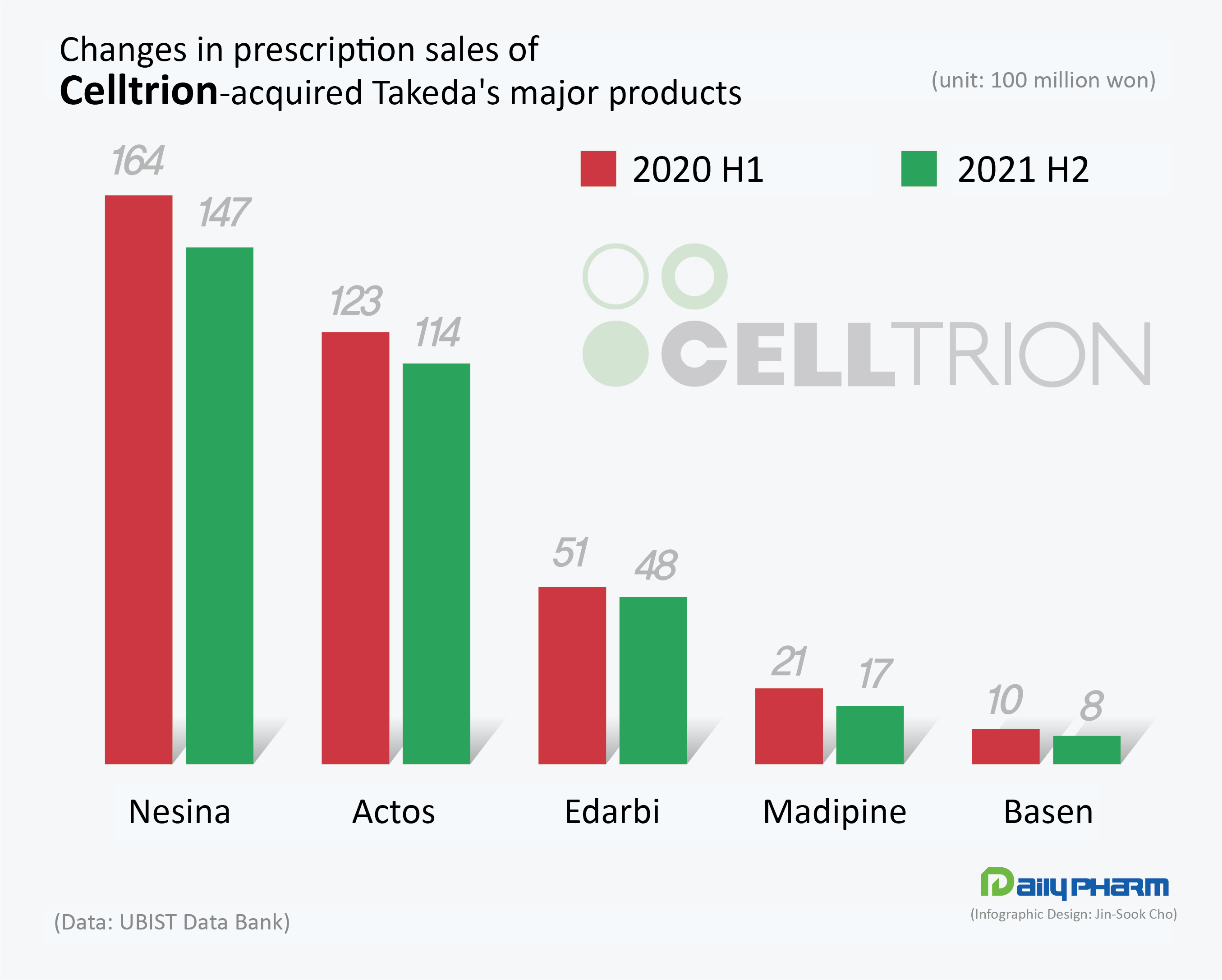 According to the pharmaceutical market research institution UBIST on the 28th, sales of all the prescription drugs that Celltrion acquired from Takeda Pharmaceutical last year amounted to 33.4 billion won in H1 of this year.