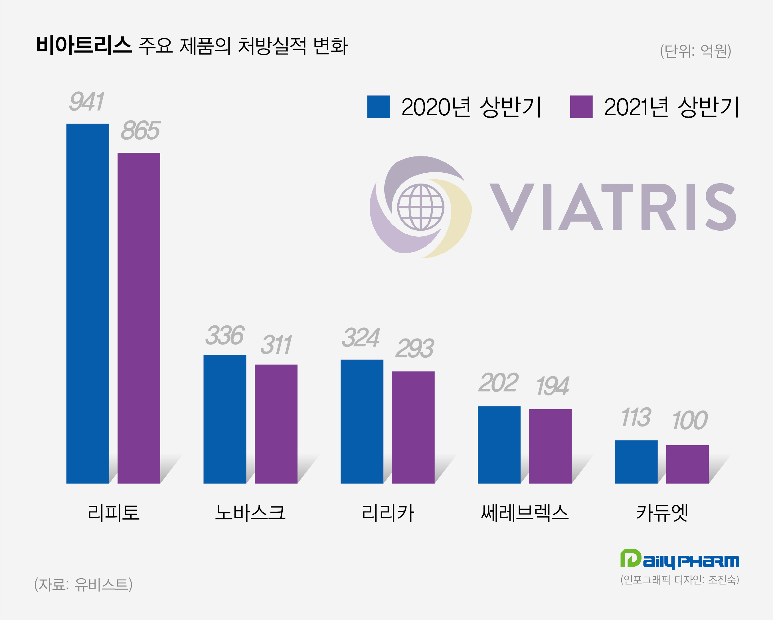 ◆The first half of Lipitor prescription was reduced by 8% According to UBIST, a pharmaceutical market research institute on the 28th, Viatris' total amount of prescriptions for major out-of-the-road prescriptions in the first half of this year is ₩14.4 billion.