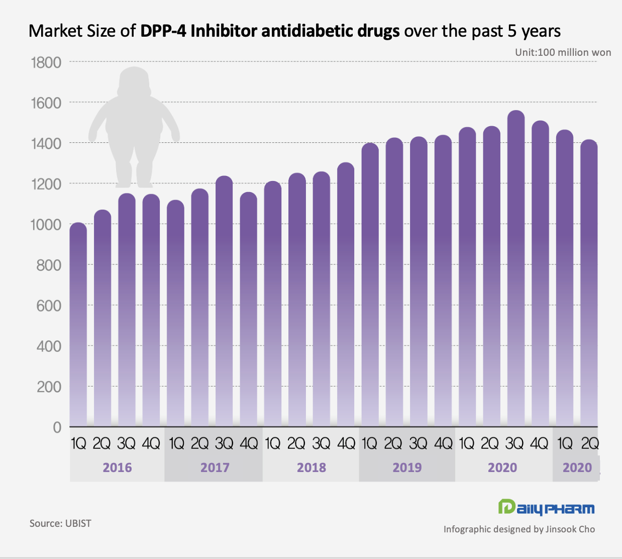 market decreased 4% in one year According to the pharmaceutical market research institution UBIST on the 27th, the diabetes drug market size for DPP-4 inhibitors was 141.6 billion won in Q2 this year.