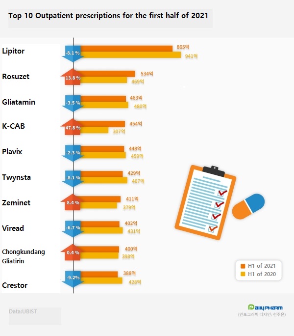 AstraZeneca's treatment for dyslipidemia, Crestor, decreased 9.2% from the previous year to ₩38.8 billion in the first half of the year, ranking among the top 10 outpatients Rx.