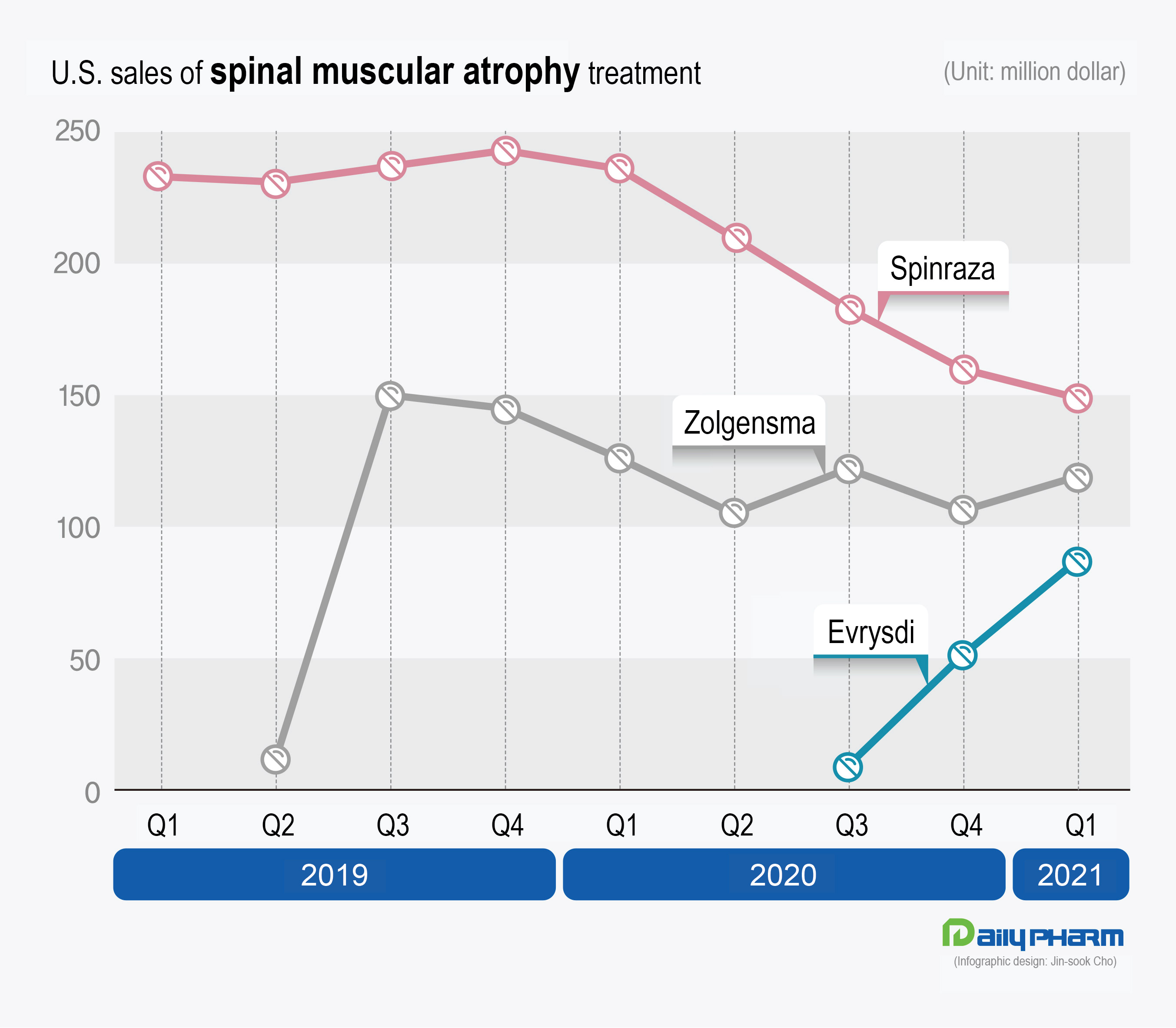 After receiving approval in August 2020, Evrysdi sold 9 million dollars (9.9 billion won) in Q3 of the same year, which increased to 51 million dollars (56.3 billion won) in Q4, then to 87 million dollars (96.1 billion won) in Q1 this year.