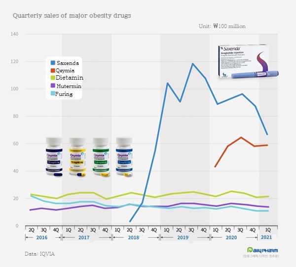 In addition to Saxenda and Qsymia, Daewoong's Dietamin, Huons' Hutermin, and Alvogen Korea's Furing were only five products that exceeded ₩1 billion in sales in the first quarter.